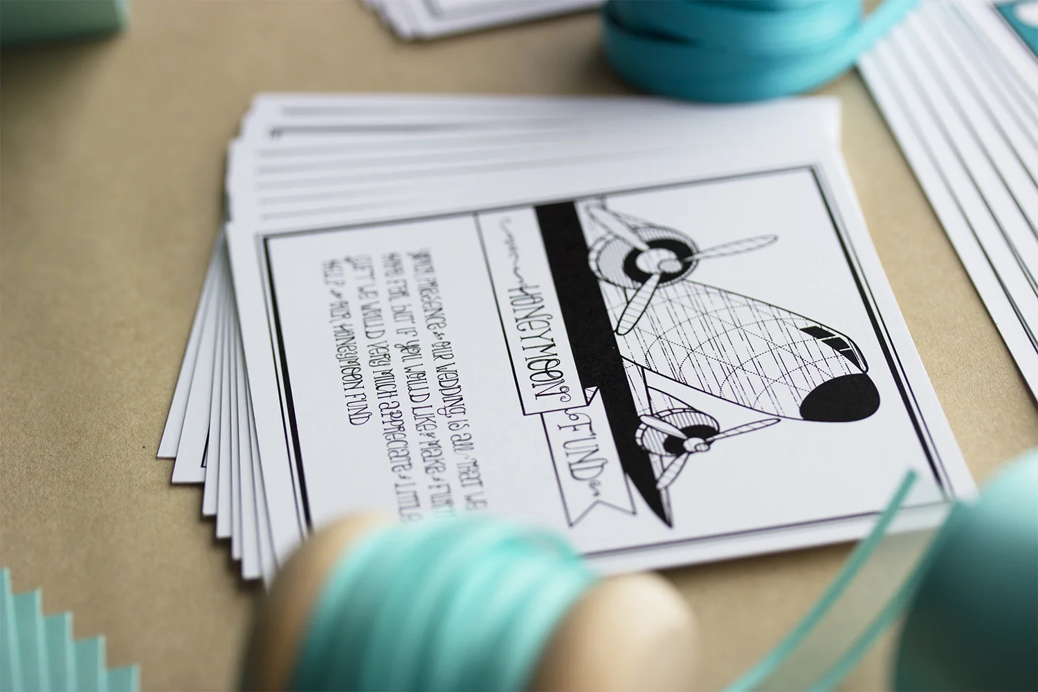 Trunks, suitcases and typewriters, oh my! This antique inspired wedding had it all! And we decided to incorporate the wedding décor right into the invitation itself. With gorgeous globe lights, vintage suitcases and authentically antique typewriters, how could you go wrong? Different tints and shades of teal were the wedding colours of choice and we just love how this whole suite turned out. Vintage for life!